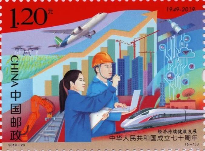 中国邮政定于10月1日发行《中华人民共和国成立七十周年》纪念邮票1套5枚,小型张1枚。邮票图案名称分别为:经济持续健康发展、社会主义民主政治推进、文化繁荣兴盛、人民生活不断改善、建设美丽中国。小型张图案名称为:祝福祖国。全套邮票面值为12元。