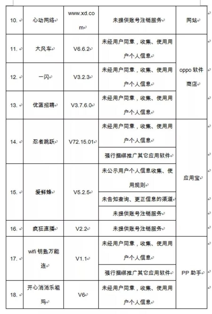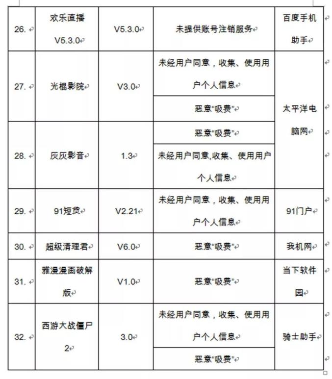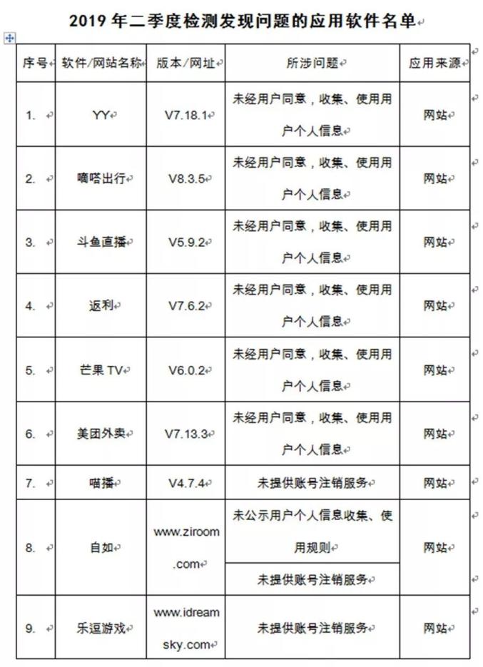 近日,工信部发布的电信服务质量的通告显示,2019年二季度检测发现问题的应用软件有YY、嘀嗒出行等32款软件,所涉及的问题包括未经用户同意,收集、使用用户个人信息;未提供账号注销服务;强行捆绑推广其它应用软件和恶意吸费等。