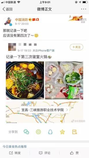 近日,一名网友发微博炫耀在寝室第三次吃火锅,还标注了吃火锅的地点: 三峡旅游职业技术学院。 不料半小时后,@中国消防 转发了这条微博,并附文: “应该没有第四次了。 ”随后当地消防监督员赶到学院,逐一排查1500余间学生宿舍。