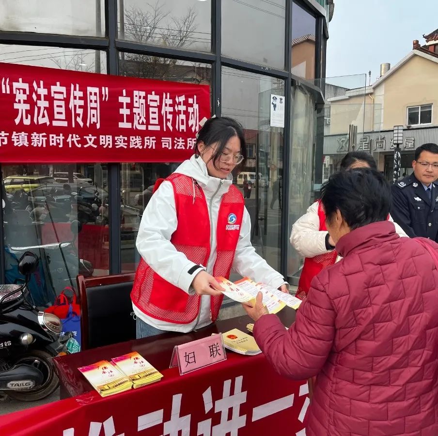 誓节镇妇联组织巾帼志愿者向市民发放宪法宣传册,向大家讲解宪法的概念、发展历程、重要地位以及宪法日、宪法周的相关知识。