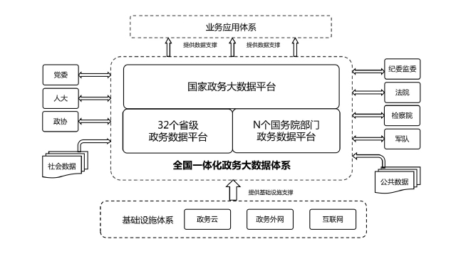 全国一体化政务大数据体系包括三类平台和三大支撑。三类平台为“1+32+N”框架结构。“1”是指国家政务大数据平台,是我国政务数据管理的总枢纽、政务数据流转的总通道、政务数据服务的总门户;“32”是指31个省(自治区、直辖市)和新疆生产建设兵团统筹建设的省级政务数据平台,负责本地区政务数据的目录编制、供需对接、汇聚整合、共享开放,与国家平台实现级联对接;“N”是指国务院有关部门的政务数据平台,负责本部门本行业数据汇聚整合与供需对接,与国家平台实现互联互通,尚未建设政务数据平台的部门,可由国家平台提供服务支撑。三大支撑包括管理机制、标准规范、安全保障三个方面。