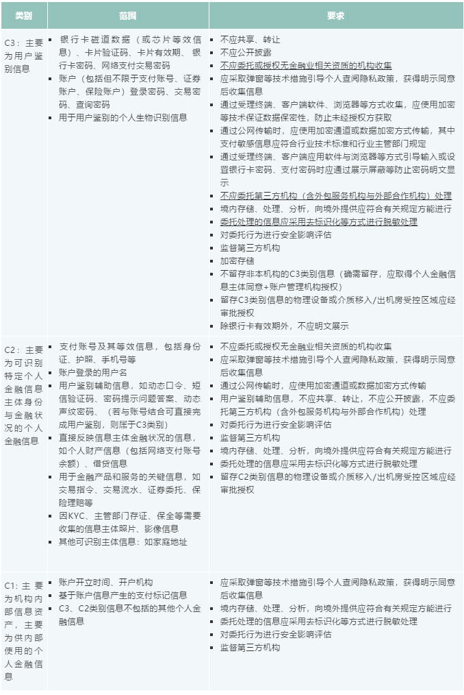 个人金融信息按照其敏感程度从高到低分为C3、C2、C1三个类别[4],以下为简要整理的类别、范围和以上行业标准针对不同类别设定的要求[5]: