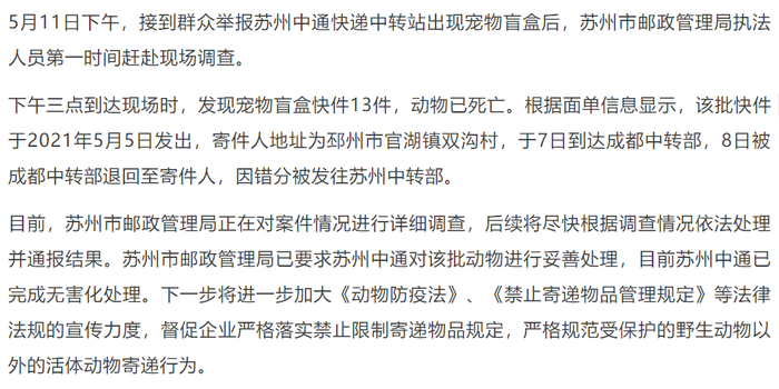 目前,苏州市邮政管理局正在对案件情况进行详细调查,后续将尽快根据调查情况依法处理并通报结果。苏州市邮政管理局已要求苏州中通对该批动物进行妥善处理,目前苏州中通已完成无害化处理。下一步将进一步加大《动物防疫法》、《禁止寄递物品管理规定》等法律法规的宣传力度,督促企业严格落实禁止限制寄递物品规定,严格规范受保护的野生动物以外的活体动物寄递行为。