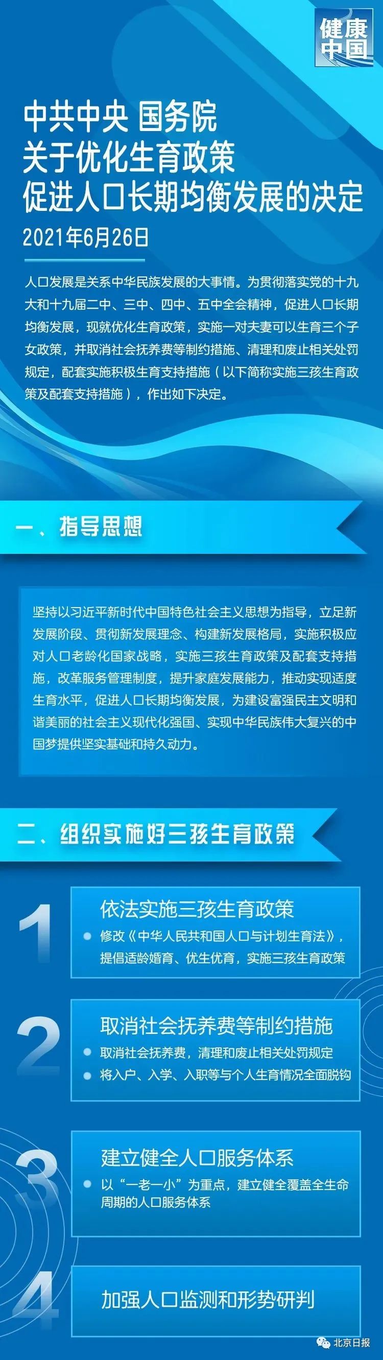 实施三孩生育政策及配套支持措施,仍然是计划生育。中央《决定》赋予了计划生育新内涵,即实施三孩生育政策及配套支持措施,改革服务管理制度,提升家庭发展能力,推动实现适度生育水平,促进人口长期均衡发展。