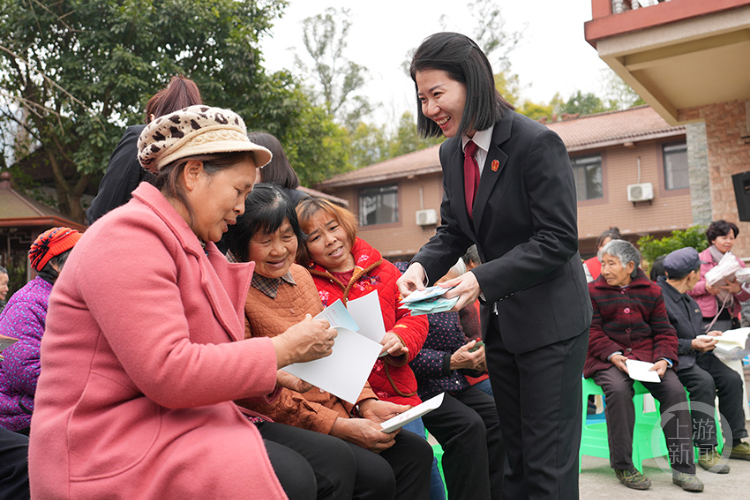 在启动仪式现场,北碚区人民法院的法官为村民赠送法律知识读本。
