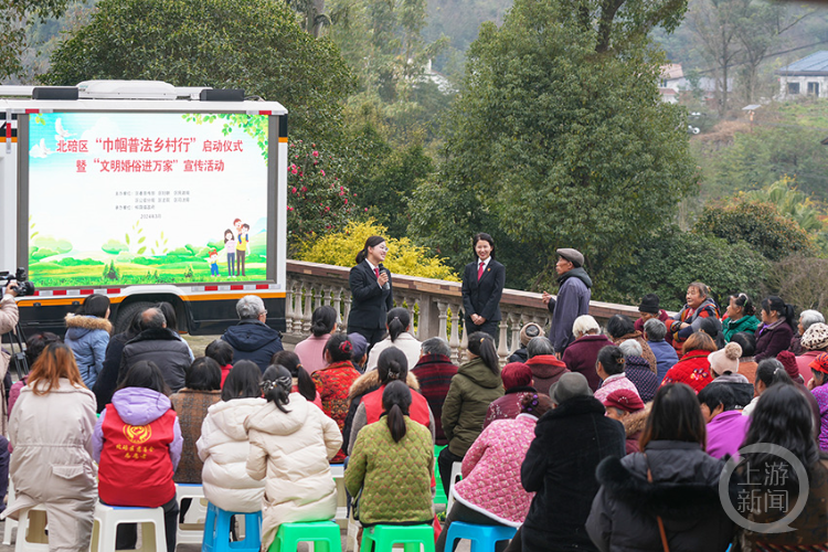 3月4日,在北碚区柳荫镇东升村,北碚区委宣传部、妇联等部门联合启动“巾帼普法乡村行”活动,期间将组织司法、法院、公安、民政等部门的法律工作者进村入户宣传文明婚俗知识,提高广大农村妇女的法律观念和维权意识,增强她们的自我保护能力。