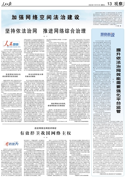 发展好治理好互联网,让互联网更好造福人类,是世界各国共同的追求。实践证明,法治是互联网治理的基本方式,必须善于运用法治思维和法治方式推动互联网发展治理。党的十八大以来,以习近平同志为核心的党中央将依法治网作为全面依法治国和网络强国建设的重要内容。党的二十届三中全会《决定》进一步提出“加强网络空间法治建设”。面对网络空间发展的新形势、新问题,面对人民群众对管好用好互联网的新要求、新期待,如何加强网络空间法治建设、提高网络综合治理效能?本期观察版围绕这一主题进行探讨。