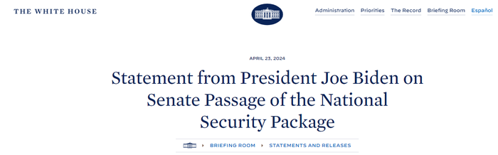 美国总统拜登随后就参议院通过援乌援以法案发表声明称,这一法案的通过“响应了历史的召唤”,一旦该法案明天送达办公桌,他将签署该法案使之成为法律。