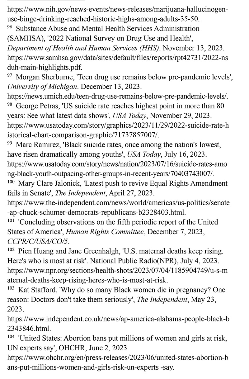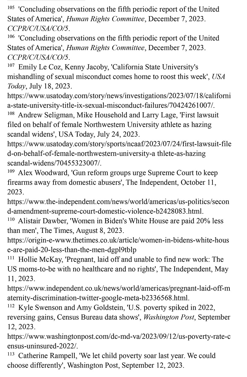 美国妇女儿童权利长期遭受系统性侵犯,保障性别平等的宪法规定付之阙如,至今未批准联合国《消除对妇女一切形式歧视公约》,而且是联合国会员国中唯一没有批准《儿童权利公约》的国家。美国参议院2023年4月否决了保障性别平等的宪法修正提案。美国每年约有5.4万名妇女因遭受怀孕歧视而失业。超过220万育龄妇女无法获得产科护理。至少有21个州命令禁止或严格限制堕胎。孕产妇死亡人数近20年来增加了一倍多。职场、校园、家庭等多领域的性暴力层出不穷。儿童的生存权与发展权堪忧。大量儿童被排除出医疗补助计划。枪支暴力成为儿童死亡的主要原因。毒品滥用在青少年群体中蔓延。46个州被发现瞒报约3.48万例寄养儿童失踪案件。