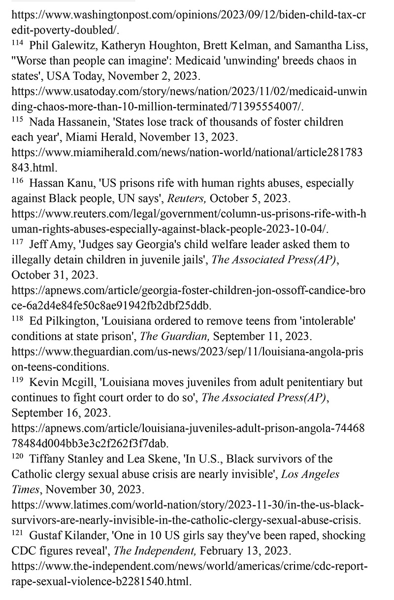 少年司法系统中的儿童遭受不人道待遇。2023年10月,联合国人权理事会在执法工作中推进种族正义和平等的国际独立专家机制调查显示,美国刑事司法系统充斥着某些特有的不人道做法。美国是世界上唯一一个判处儿童终身监禁不得假释的国家。116在佐治亚州,儿童福利机构的负责人要求法官将有精神问题和行为问题的儿童拘留在少年监狱。117自2022年10月以来,多达80名儿童被带到路易斯安那州以暴力著称的安哥拉监狱,关押在死刑犯等待处决的牢房里。118尽管这些儿童与成年囚犯隔离,但他们遭受了危险的热浪,长时间被关在牢里,使用的是污水,更无法获得教育。119