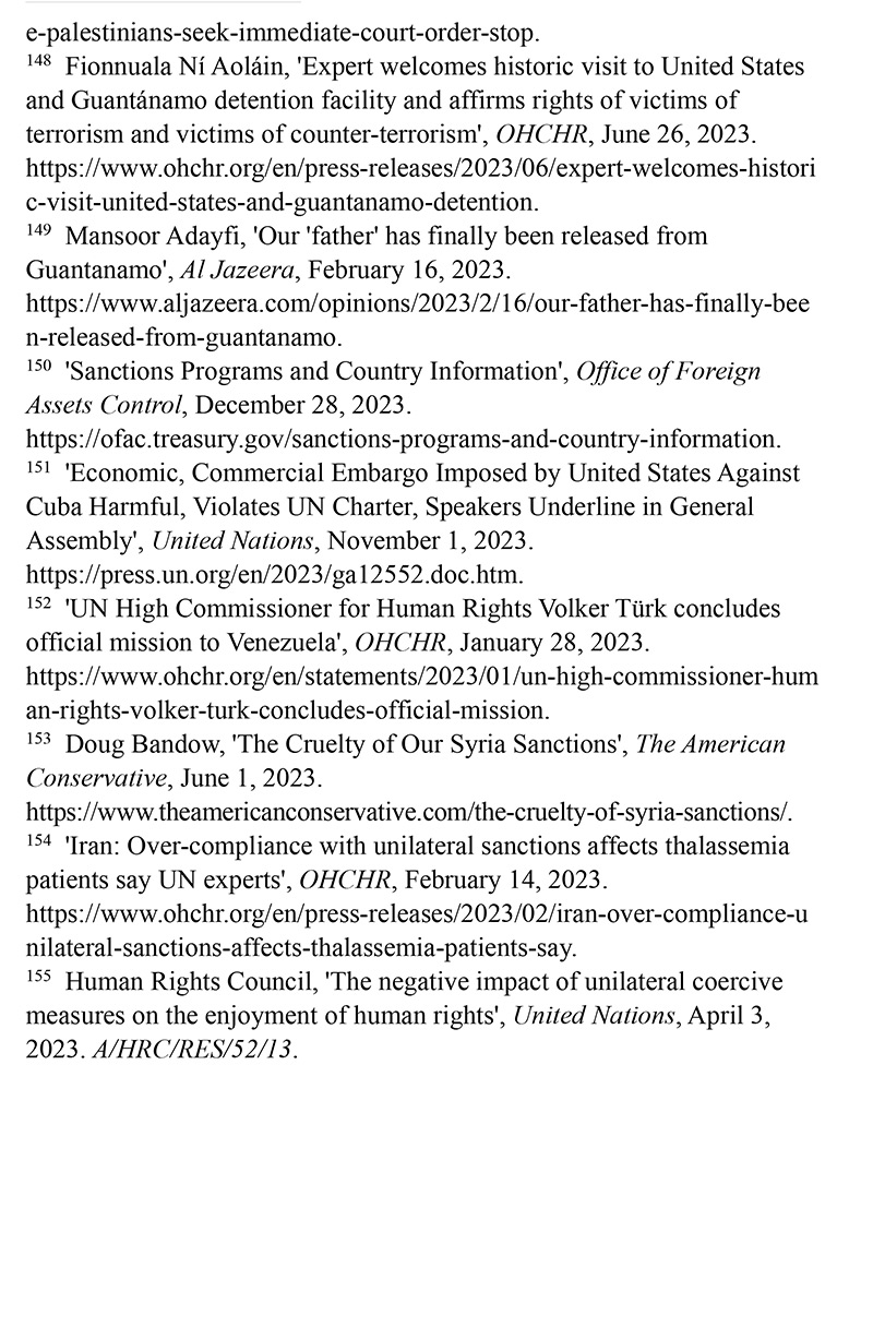 长期滥施单边制裁造成严重人道主义后果。自1950年以来,美国使用的制裁次数居全球之首。根据美国财政部2023年12月28日公布的数据,美国制裁的国家超过20个。150第78届联合国大会发言人2023年11月1日指出,美国对古巴实施的经济、商业和金融封锁违反了《联合国宪章》,对古巴人民造成了毁灭性影响。151联合国大会2023年11月2日通过决议,再次敦促美国终止对古巴长达60多年的经济、商业和金融封锁,这是联合国大会连续第31年通过类似决议。2023年1月28日,联合国人权事务高级专员沃尔克·图尔克在访问委内瑞拉后表示,2017年以来美国施加的制裁加剧了委内瑞拉的经济危机,严重阻碍人权的实现。152“美国保守派”网站2023年6月1日报道,美国制裁进一步加剧了叙利亚人民的贫困。叙利亚70%的人口面临食物短缺,其中1200万人三餐不继,290万人食不果腹。153联合国人权理事会单边强制措施对人权负面影响问题特别报告员阿莱娜·杜晗2023年2月14日指出,美国对伊朗的制裁减少了地中海贫血症患者从国外进口救命药物的机会,导致伊朗患者的并发症和死亡率增加,是对健康权的侵犯。154联合国人权理事会2023年4月3日通过决议指出,单边强制性措施会对目标国家广大民众的人权产生深远影响,对穷人和处境最脆弱的人影响尤为严重。决议谴责某些大国继续单方面适用单边强制性措施。美国在该决议表决中投了反对票。155