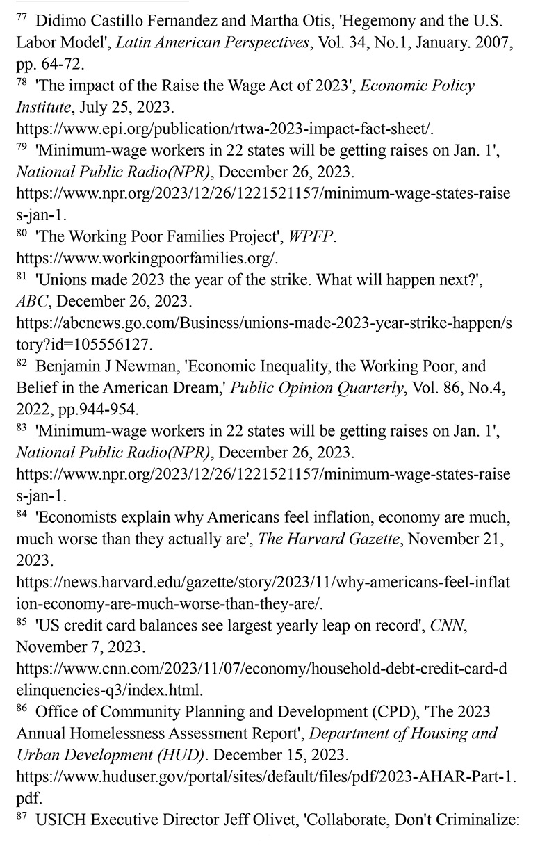 “工作者贫困”问题突出。美国劳动力市场状况发生了结构性变化,低薪岗位和缺乏监管普遍存在。77有大批“工作穷人”终日劳作,其工资水平却难以维持基本生计,还缺乏应有的社会保障。美国联邦最低时薪标准自2009年以来一直没有上调。78美国劳工部的数据显示,2023年仍有20个州维持联邦最低时薪标准。79美国有1150万个低收入工薪家庭,包括1480万儿童在内的2990多万美国人生活在这些低收入工薪家庭。80劳资收入增长悬殊导致多行业大面积罢工。2023年,美国发生了21世纪以来波及范围最广的罢工潮,包括影视、制造、医疗、媒体在内的多个行业都出现大规模罢工。81加利福尼亚州大学公共政策与政治学院副教授本杰明·纽曼评论称,陷入结构性贫困之中的“工作穷人”既缺乏机会平等,也难以向上流动,他们极大地降低了对“美国梦”的信念。82