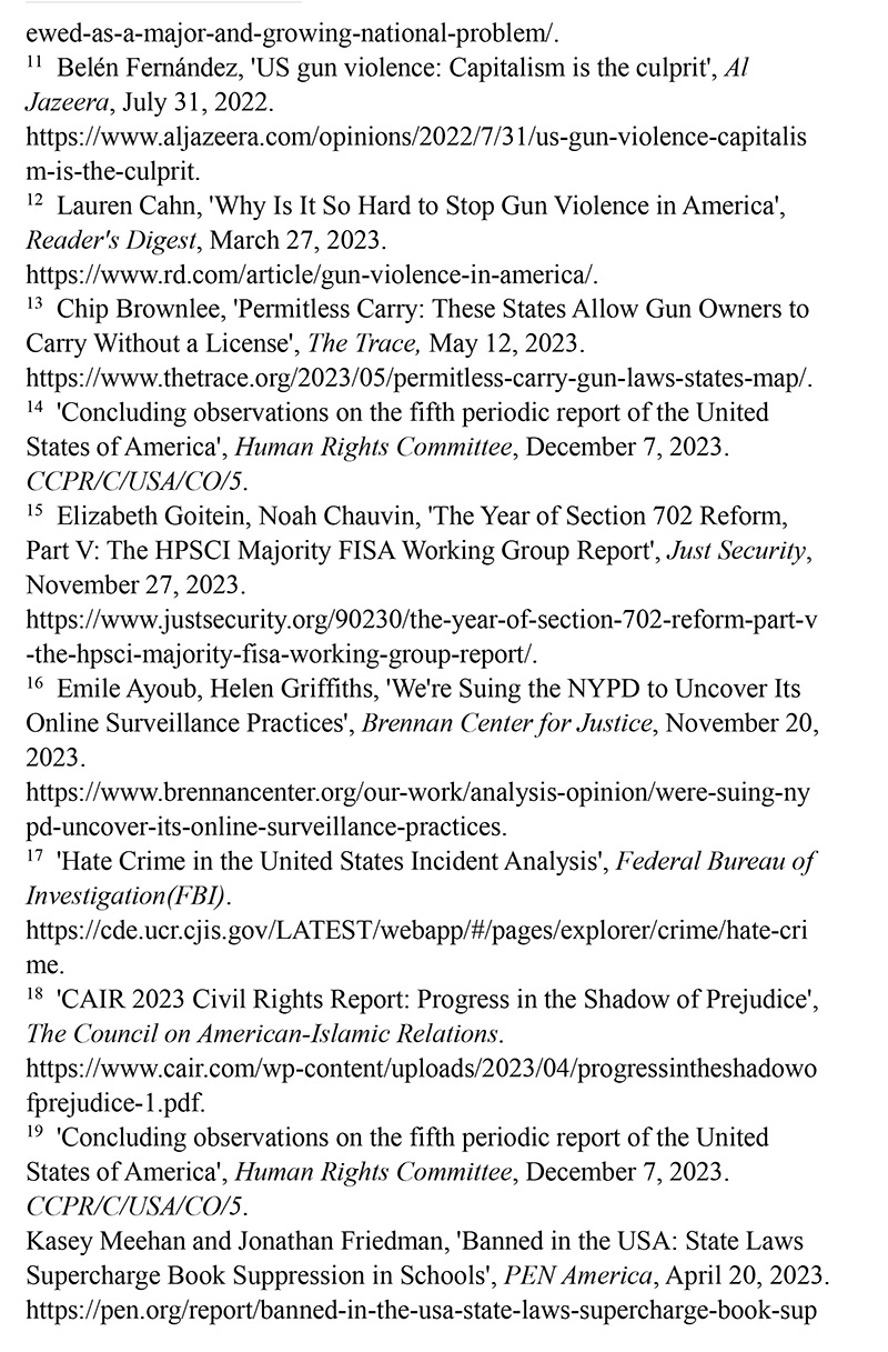 政府滥用权力监控公民隐私。联合国人权事务委员会指出,美国《涉外情报监视法》第702条的范围过于宽泛,该法不仅允许美国执法人员监视外国人的电子通信,执法人员还可能利用法律漏洞在没有搜查令的情况下获取大量美国公民的通讯信息(即“后门搜查”),并且缺乏明确透明的监督机制。14美国众议院情报委员会2023年11月16日发布的报告显示,美国联邦调查局将《涉外情报监视法》第702条规定转用于进行国内监控,“广泛而持续地”监控国会议员、国会竞选活动捐助者以及反种族主义抗议者的通讯。15布伦南司法中心网站2023年11月20日报道,十几年来,纽约警察局滥用社交媒体从事非法活动,包括监视公共集会、在没有证据的情况下跟踪公民个人及其联系人等,而这些行为并未受到监督和问责。16