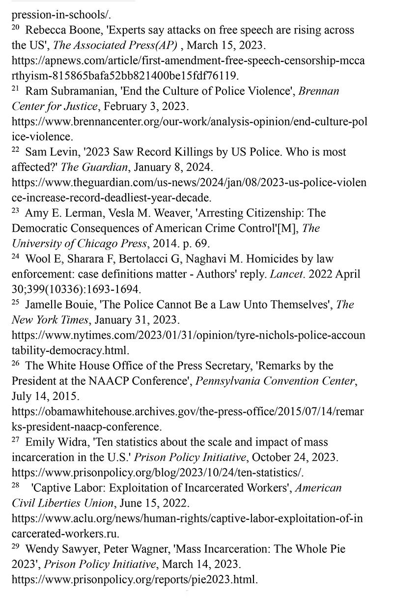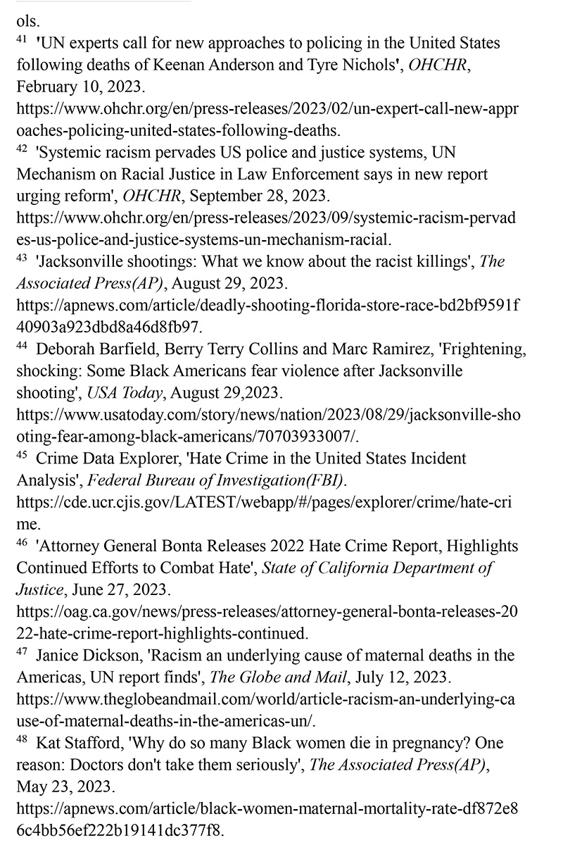 非洲裔在执法领域面临严重种族歧视。2023年1月3日,洛杉矶31岁的非洲裔男子基南·安德森涉嫌交通肇事,警方在制服他的过程中使用电击枪击中其6次,致其心脏病发,送医不治身亡。392023年1月7日,田纳西州孟菲斯市的警察以“鲁莽驾驶”为由将29岁的非洲裔男子泰尔·尼科尔斯拦下,并对其进行长达数分钟的残忍殴打。三天后尼科尔斯因伤势过重去世,而事后的调查无法证实警察关于其“鲁莽驾驶”的说法。40这两起非洲裔遭受警察暴力执法身亡案例引发多名联合国专家的高度关注。专家们强调,在两起事件中,警察使用的武力违反保护生命权,禁止酷刑和其他残忍、不人道或有辱人格待遇或处罚的国际准则,也不符合联合国《执法人员行为守则》和《执法人员使用武力和火器的基本原则》。41联合国人权理事会在执法工作中推进种族正义和平等的国际独立专家机制在对美国实地访问后发布报告指出,针对非洲裔的系统性种族主义已经渗透到美国警察队伍和刑事司法系统。非洲裔被警察杀害的可能性是白人的3倍,被监禁的可能性是白人的4.5倍。在每年1000多起警察杀人案件中,只有1%的涉事警察被指控。报告警告说,美国如果不按照国际标准改革警察使用武力的规则,许多杀戮将继续发生。42