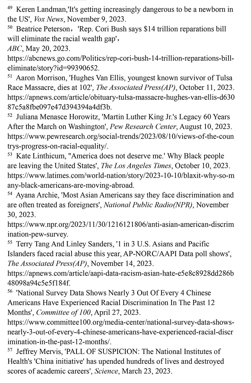美国种族主义根深蒂固,种族歧视情势严重。联合国专家指出,针对非洲裔的系统性种族主义已经渗透到美国警察部队和刑事司法系统。由于医疗服务领域存在严重的种族歧视,非洲裔孕产妇死亡率几乎是白人女性的3倍。近六成亚裔表示面临种族歧视,针对华裔科学家的“中国行动计划”贻害深远。种族主义意识形态在美国社交媒体、音乐、游戏等多平台恶性传播并跨国溢出,成为极端种族主义的主要输出国。