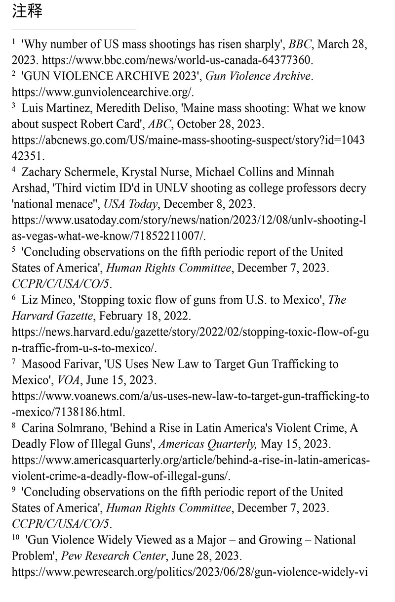 枪支暴力造成惨痛生命代价。数据显示,美国所有类型的枪支暴力事件都呈上升趋势。1根据“枪支暴力档案”网站统计的数据,2023年美国至少发生了654起大规模枪击事件。枪支暴力导致近4.3万人死亡,平均每天死亡117人。2例如,美国广播公司新闻网站2023年10月28日报道,缅因州发生大规模枪击事件,造成至少18人死亡,13人受伤。3《今日美国报》网站2023年12月6日报道,拉斯维加斯3名大学教授被一名前同事枪杀。美国大学教授协会主席艾琳·马尔维称,枪支暴力是“不可接受的国家威胁”,敦促美国政府进行枪支政策改革。4美国与枪支有关的伤亡人数激增,引发联合国人权事务委员会的严重关切。5