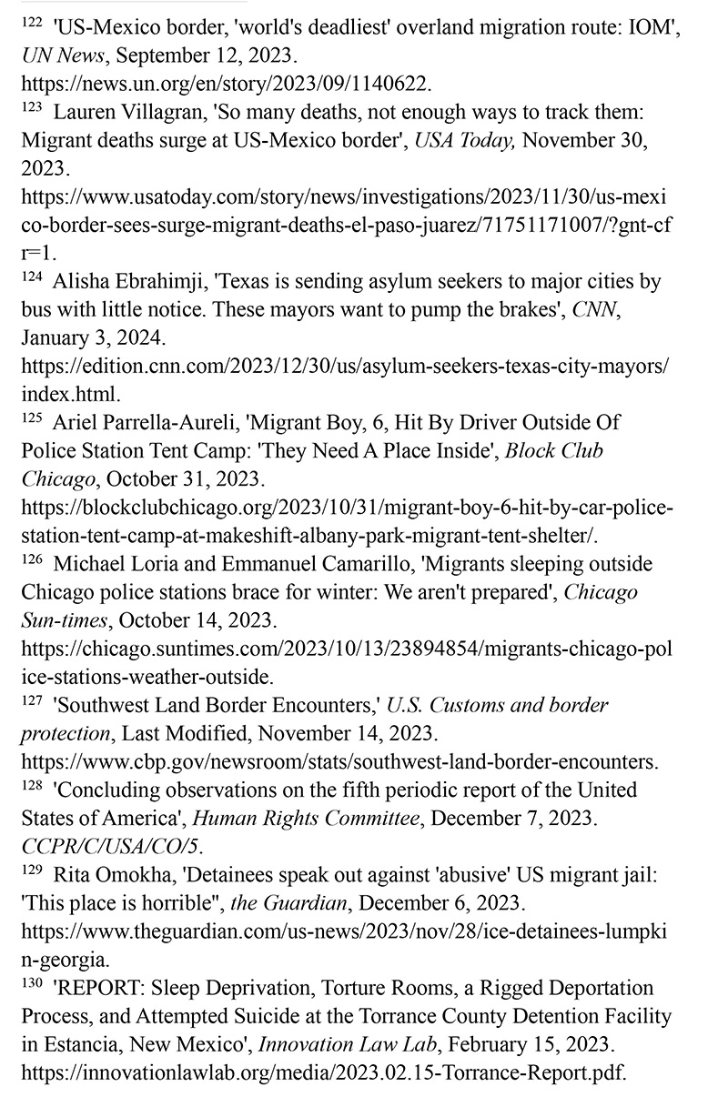 入境移民遭受酷刑及其他不人道待遇。2023财年,在美国南部边境遭逮捕或驱逐的移民总数达240多万人,再创历史新高。127联合国人权事务委员会对移民在美国受到长时间的拘留表示担忧,批评美国的拘留所条件恶劣,人满为患,被拘押者无法获得食物、水和医疗服务,导致包括儿童在内的许多人死亡;公共和私营移民拘留设施存在性暴力、长期单独监禁、虐待等侵犯人权问题。128英国《卫报》网站2023年12月6日报道,由美国私人监狱公司CoreCivic运营的、位于佐治亚州兰普金的斯图尔特拘留中心存在长期单独监禁、性虐待、医疗疏忽以及强迫劳动等令人担忧的问题。129创新法律实验室于2023年2月15日发布报告揭露,由CoreCivic运营的、位于新墨西哥州埃斯坦西亚的托兰斯县拘留所存在对被关押者实施酷刑现象。在夜间,每隔15分钟就会有一名警卫开着收音机的最大音量走过这些房间,大声地敲着门,并用手电筒强光照进房间,吵醒任何可能睡着的人。在寒冷的天气里,每个房间的通风管道整夜都在吹冷空气。一些人试图用卫生纸或毯子盖住通风口,但警卫们拿走了用来阻挡冷空气的任何东西。这些牢房里,厕所污水和粪便溢出,人们被迫睡在臭气熏天的地板上。130