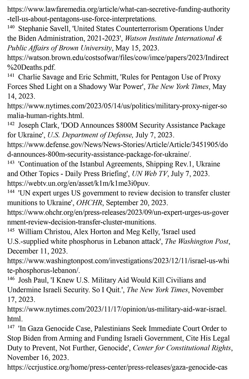 持续向冲突地区提供武器。美国国防部2023年7月7日发布的新闻稿显示,美国向乌克兰提供的价值8亿美元的额外军事援助中,包含大量集束弹药。142联合国秘书长副发言人哈克2023年7月7日回答记者提问时表示,联合国秘书长安东尼奥·古特雷斯希望各国遵守《集束弹药公约》,不要在战场上继续使用集束弹药。143联合国人权高专办网站2023年9月20日报道,联合国人权理事会酷刑和其他残忍、不人道或有辱人格的待遇或处罚问题特别报告员爱丽丝·吉尔·爱德华兹2023年7月向美国政府发出紧急信函,警告集束弹药会对平民造成严重伤害。144《华盛顿邮报》网站2023年12月11日报道,美国每年流入以色列的军火达数十亿美元,以色列在10月对黎巴嫩南部的一次袭击中使用了美国供应的白磷弹药,造成至少9名平民受伤。145美国国务院政治军事事务局前局长乔希·保罗2023年10月18日在《纽约时报》网站发表专栏文章指出,美国每年向以色列提供至少38亿美元军事援助,加沙地带最严重的人员伤亡大多是由美国提供的弹药所导致,谴责这种军事援助无视人权问题。146美国人权组织“宪法权利中心”2023年11月16日报道,灭绝种族与死刑问题专家威廉·沙巴斯指责美国未能履行防止种族灭绝的法律义务,违反了习惯国际法和《防止及惩治灭绝种族罪公约》。147
