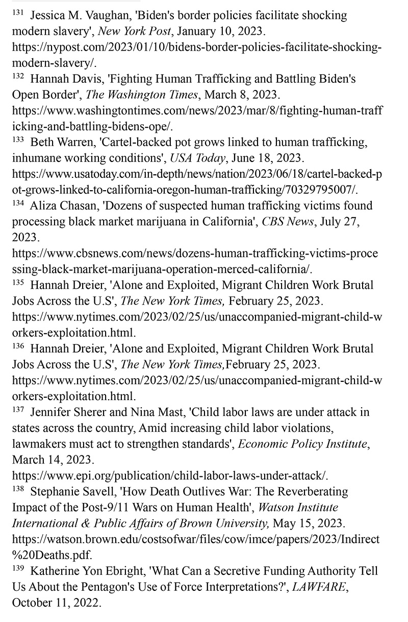 边境政策助长现代奴隶制。美国政府的边境政策加剧人口贩运问题。被遗弃在边境州城镇或被运往全国各地的移民,往往处于孤立无援境地,最容易受到剥削和贩运。那些非法越境后聚集在拥挤、缺乏监管的庇护所的儿童也成为人口贩子的猎物。131在美国被贩运的人中,72%是移民,其中大部分是通过偷渡入境,人口贩运的受害者多是妇女和儿童。打击贩卖妇女联盟的一项研究估计,60%的越境无人陪伴移民儿童被犯罪集团强迫从事儿童色情甚至贩毒活动。132《今日美国报》网站2023年6月18日报道,移民被贩毒集团诱骗到加利福尼亚州北部和俄勒冈州南部的农场从事大麻种植,遭受奴役和强迫劳动。被贩卖的移民在大麻农场遭持枪恐吓,每天被迫工作16个小时甚至更长时间,有时连饭都吃不上。移民妇女遭到性侵犯,有些人被谋杀,尸体被丢弃在荒野中。133美国哥伦比亚广播公司新闻网2023年7月27日报道,近60名遭人口贩运的受害者被偷运到加利福尼亚中部的一个非法大麻种植场所,被强迫加工大麻,向偷运者偿还债务。134