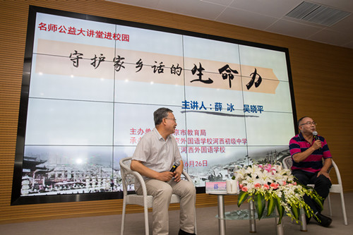 为了让我市中小学生更多地了解南京方言文化,了解南京城市的历史发展和文化脉络,激发孩子们知南京、爱南京的家乡情感,提升同学们的传统文化素养,6月26日,南京市教育局、南京市语言文字工作委员会特别邀请原南京市作家协会副会长、著名作家薛冰老师以及南京电视台著名方言节目主持人吴晓平老师来到南京河西外国语学校,以“名师公益大讲堂”进校园的形式,开设《守护家乡话的生命力》方言文化专题讲座,通过对话交流的方式让同学们了解南京方言的演变过程和在历史上曾经发挥的重要作用。市语委副主任、市教育局副巡视员杨林国;市教育局语工处、法规处、市教科所相关负责人;市文广新局、市档案局代表;各区教育局、语委办联络员以及南京河西外国语学校师生及家长代表共计200余人参加了活动。