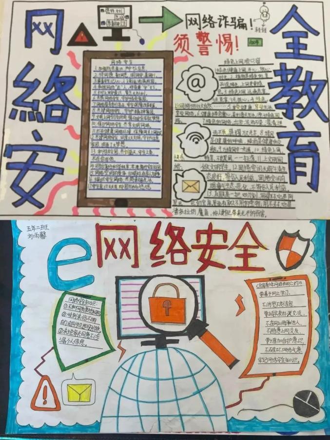 两间房中心校通过主题班队会等形式,向同学们宣讲了个别网络违法案例,并说明了网络并非法外之地,法律的底线不可逾越,在网络上发表言论时更需要保持边界。同学们围绕网络安全创作出一幅幅主题突出、构思独特、图文并茂的手抄报。