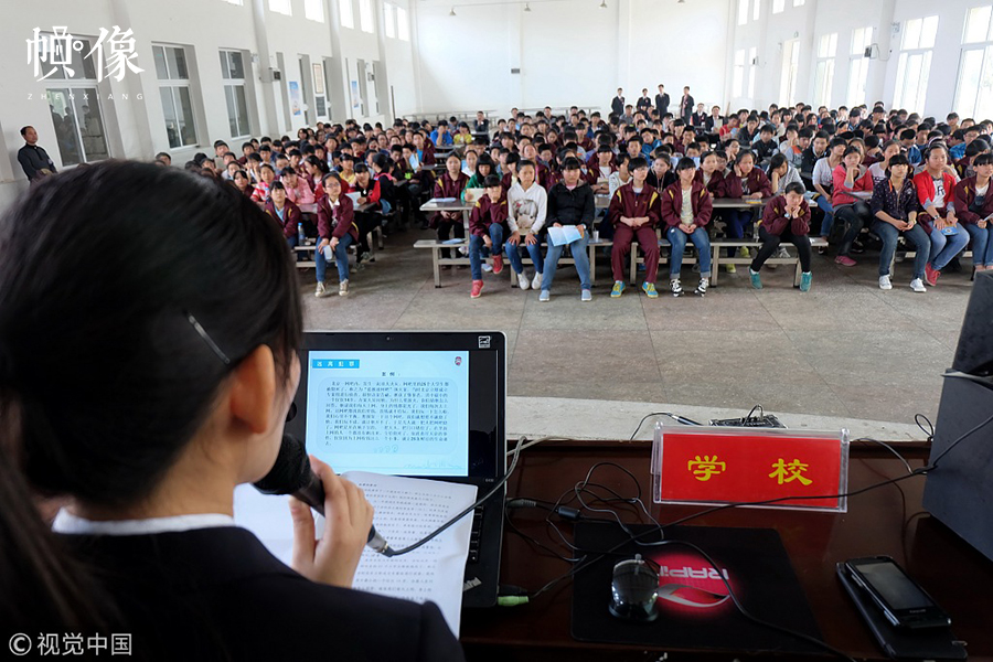 2015年04月23日,湖南省常德市,常德市鼎城区检察院“送法进学校”活动来到周家店中学,通过为学生上法律知识课,发放预防未成年人犯罪宣传册,让学生们品尝了一份“法律大餐”。视觉中国