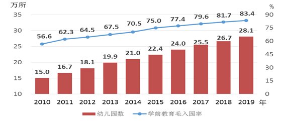 图2 2010—2019年幼儿园数及学前教育毛入园率