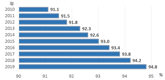 2.义务教育实现全面普及。2019年,中共中央、国务院印发《关于深化教育教学改革全面提高义务教育质量的意见》,进一步推动了我国义务教育改革与发展。2019年,全国共有义务教育阶段学校21.3万所[2],其中普通小学16万所,初中学校5.2万所。全国共有专任教师1001.7万人,其中普通小学626.9万人,初中374.7万人,分别比上年增长2.9%、2.9%和3%。全国在校生1.54亿人,其中普通小学1.06亿人,初中0.48亿人,分别比上年增长2.6%、2.1%和3.8%。义务教育阶段在校生中进城务工人员随迁子女1427万人,占在校生比重为9.3%,比2010年提高1.6个百分点。全国九年义务教育巩固率达94.8%,比上年提高0.6个百分点,基本实现“达到95%”的《纲要》目标(见图3)。小学学龄儿童净入学率达99.94%,初中阶段毛入学率为102.6%[3]。