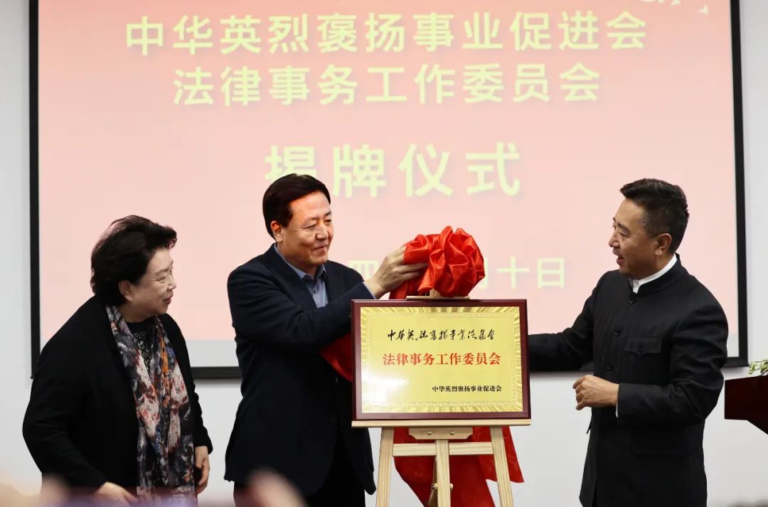 中华英烈褒扬事业促进会会长李中水、中华全国律师协会会长高子程、中华英烈褒扬事业促进会特邀专家何晔晖为法律事务工作委员会揭牌