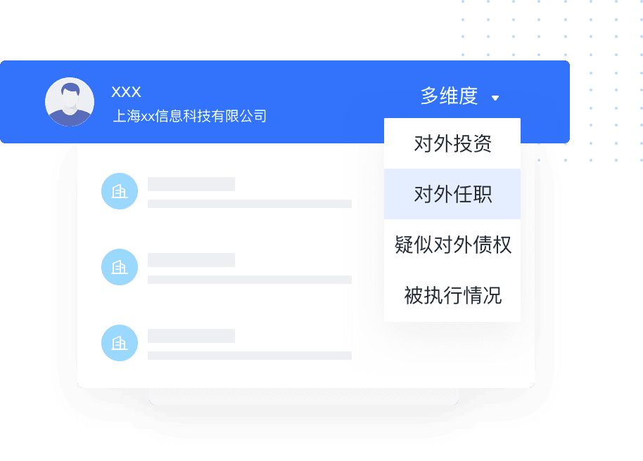 主要展示以关联企业为主的相关信息,通过对外投资、对外任职、疑似对外债权、被执行情况等维度,多方位整合个人资料,精确定位被查询人员。