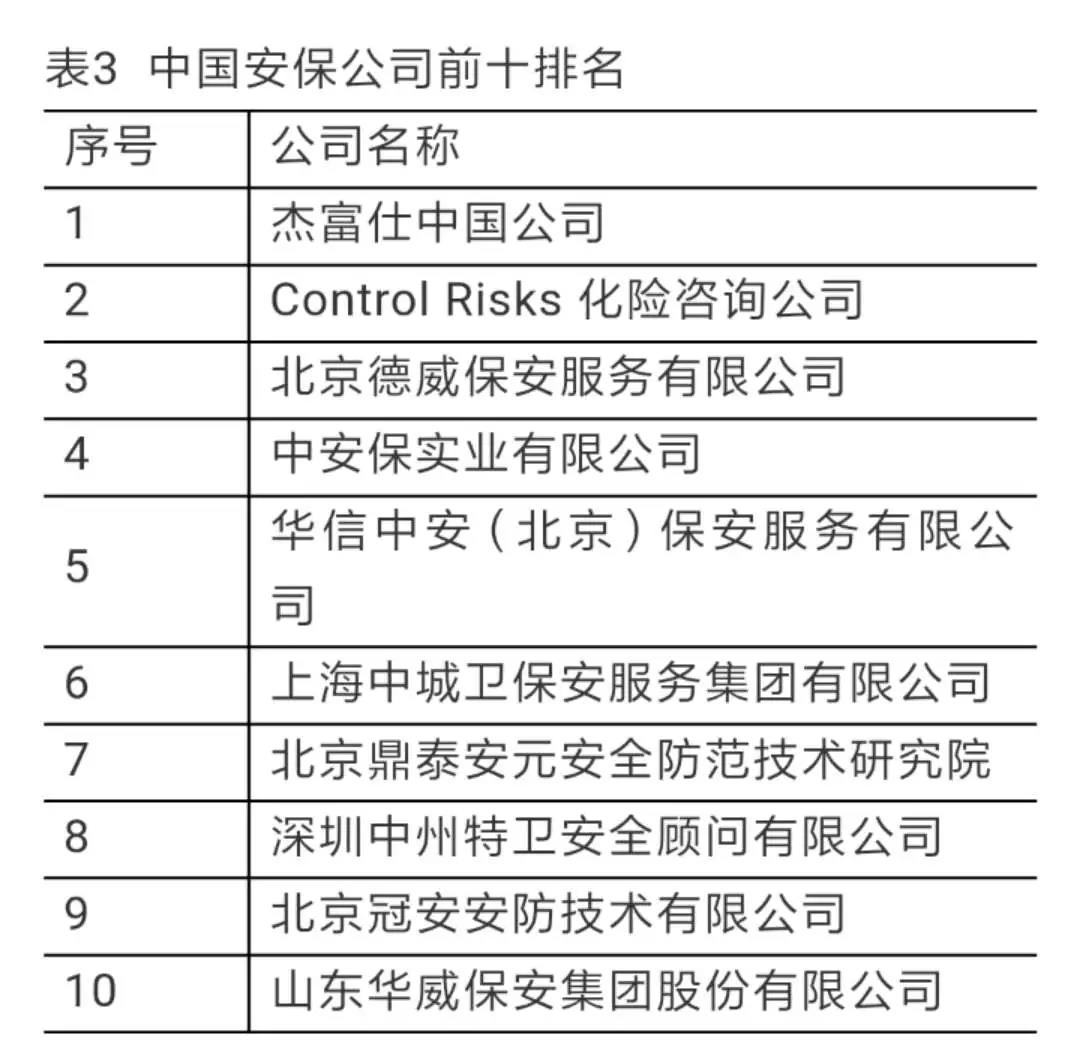 随着中国海外投资增加,遍布世界的中国企业可能成为全球私营安保公司的重要客户。在2012年联合国大会上,中国政府赞成就制定一个私营安保公司的国际规章框架问题展开深入讨论。可见,中国政府并不排斥私营安保公司的发展,主张加强国际磋商,寻求合理规制,发挥其正面作用,抑制其不良影响。目前,中国并不存在类似于国外的私营安保公司,但中国有大量的提供安全保障服务的安保服务公司。虽然中国安保服务公司与国外私营军事公司有极大的区别,但在安全培训、情报提供、风险评估、后勤服务保障等安全保护方面,有着共同一致性。截至2017年,中国大约有4 000余家安保公司,但开展海外业务的寥寥无几。目前中国开展海外业务的安保公司不超过40家,真正能够拿到业务订单的仅有几家,如伟之杰安保集团、华信中安集团、德威、克危克险等公司(见表2)。