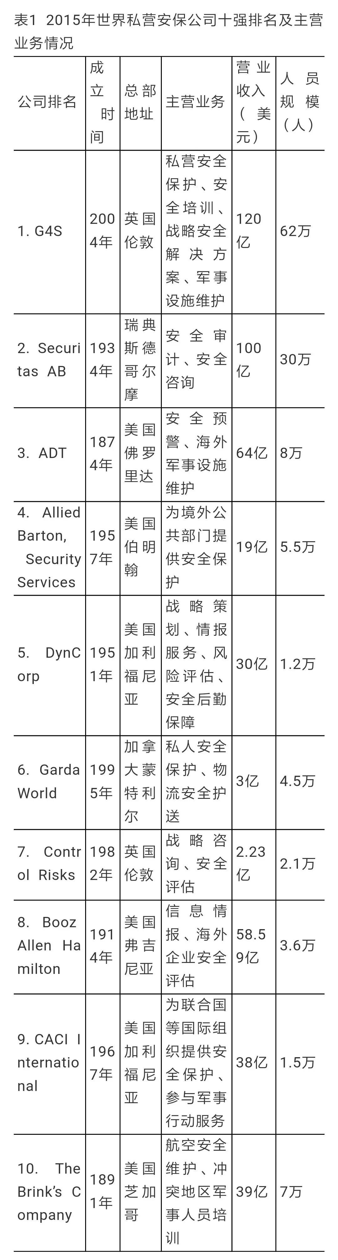 资料来源:The UltimateProfessional Network, 30 Most Powerful Private Security Companies in theWorld, The International Advisory Board, 2015。