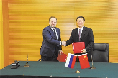 会后,环境保护部部长陈吉宁与俄罗斯自然资源与生态部部长东斯科伊签署会议纪要。记者 贾继恒 摄