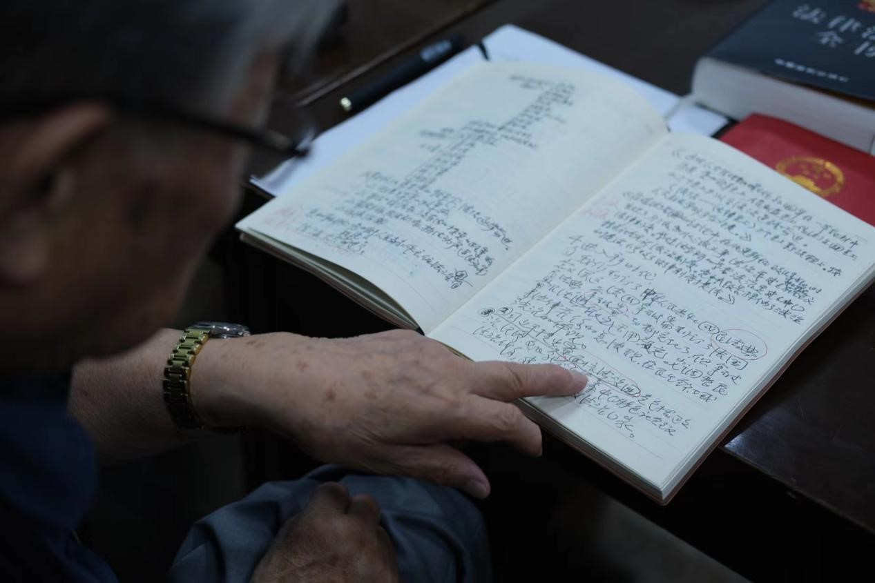 新冠疫情之前,步入鲐背之年的穆镇汉依然保持法学研究的热忱,摘录有关“全面依法治国”的理论表述。澎湃新闻记者 林平 摄