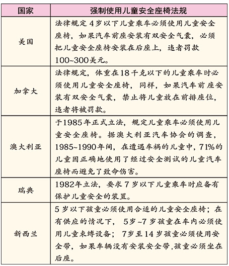 早在30多年前,欧美等国家已经立法规范强制使用儿童安全座椅。据了解,目前,世界上有96个国家和地区出台了强制使用儿童安全座椅的法律法规,其中美国、英国、瑞典等国家的使用率很快便超过了90%。上述地区立法后的儿童乘车伤害案例大幅下降。如今,国内部分地方政府已率先将强制使用儿童安全座椅纳入交通法规。