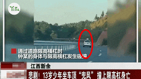▲ 少年将头伸出车外撞上限高杆(动图来源于网络)▲