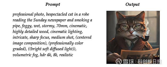 下图以生成一张“穿着长袍、戴眼镜、读报纸、抽烟斗的猫”为例,使用者并没有明确图像中的细节,例如猫是什么颜色、什么姿势、具体穿什么衣服,这些都是AI系统自行填补的内容。