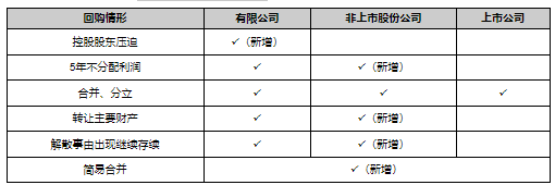 由此,随着股权转让流动性和公司治理严格程度的提升,新《公司法》形成了由繁至简的法定回购请求权体系,各类型公司的股东可以在如下情形下请求公司回购股份。