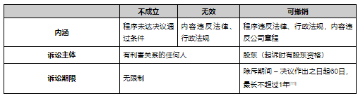 公司决议瑕疵的“三分法”:三种决议瑕疵的要素归纳请见下表,主要的区分难点在于程序瑕疵的识别,如程序瑕疵严重到可被认定决议未达到通过条件,则将被认定为不成立,若程度相对较轻,则将被认定为可撤销,若仅为“轻微瑕疵”,则不影响决议于可撤销无疑拥有更大的诉讼灵活性。