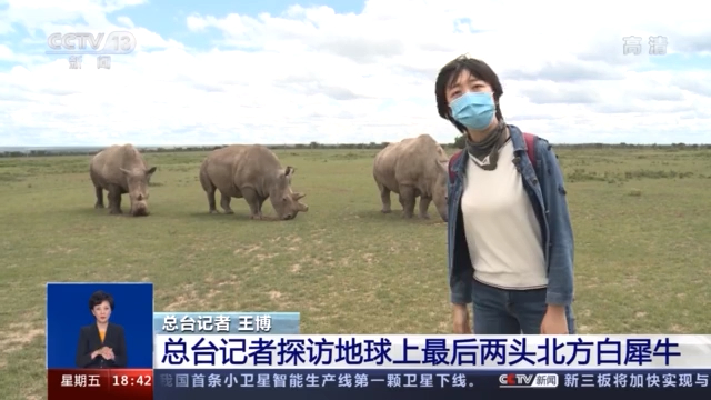 总台记者 王博:我现在已经到了奥尔佩杰塔自然保护区,在我身后不到十米的距离,有三头白犀牛,最左边的这一头是南方白犀牛,右边这两头就是目前地球上仅存的两头北方白犀牛。它们现在吃的这个饲料是专门为它们准备的营养套餐。