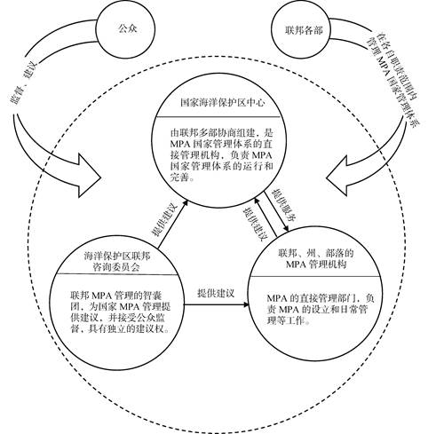 其中, 海洋保护区联邦咨询委员会在美国海洋保护区国家管理体系的构建和发展过程中有着不可或缺的作用。该委员会由商务部建立, 可以直接向商务部和内政部部长提出关于海洋保护区国家管理体系的建议, 具有独立的建议权。委员会由20位非联邦政府成员组成(由副国务卿任命, 内政部部长审核), 包括各种利益相关者的代表, 包括但不限于科学家、学者、商业渔民、垂钓者、潜水员、州和部落的资源管理者、能源和旅游业人员、环境保护者等[]。