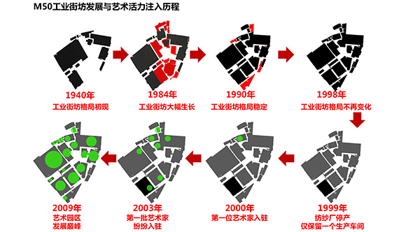 王林:艺术家有他们的敏感度,M50的仓库便宜,空间大,而且在市中心,方便和人接触,所以对于艺术家而言是非常合适的位置。我觉得对于这个区域来说,艺术家的聚集不只是炒高它周边地区的房地产价值,更是为城市带来活力和创意。对于当时的纺织控股集团而言,他们也想保留春明粗纺厂这个地方,因为他们的工人、这些个体对于这个场所是有集体记忆的情怀,他们也不想失去这个空间。所以当时我提出了一个方案:如果工厂能够为艺术家保留这些空间,用于艺术文化创意、而非纯粹的商业开发,我们就给予他们支持,不将M50计入这里原有的规划开发总量。现在,M50这块地方就作为创意产业区被保留下来。