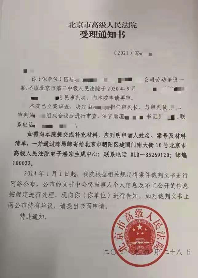 为了要让这个事情有一个最终说法,二审结束后,王女士向北京市高级人民法院提出了再审申请。2021年4月28日,王女士收到了北京市高级人民法院的受理通知书。