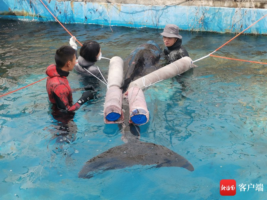 为了救治海豚,儋州海花岛海洋生物科研基地工作人员给海豚消毒、抽血、体检、上药,想方设法通过给海豚进行灌胃来保证营养供应。经过对海豚进行了长达11个月的救治,搁浅海豚的身体机能已完全恢复,经几个月的野化训练,它具备自主捕食、辨识同类、独立生存等一系列大海生存技能,于2023年3月1日重回大海怀抱。