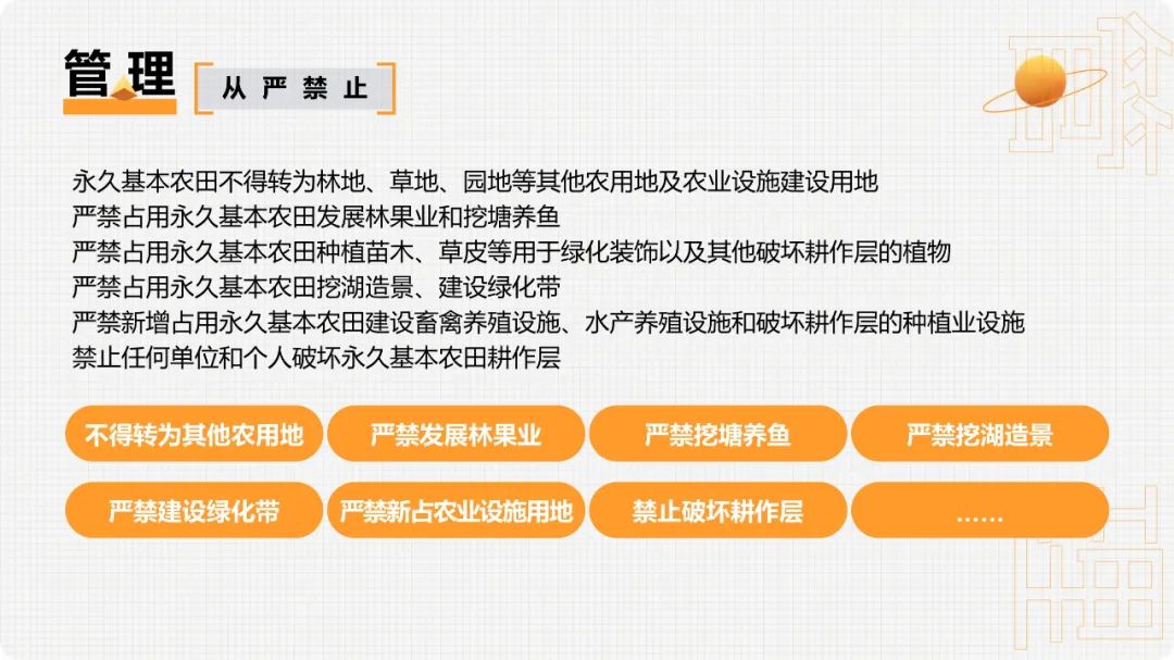 严禁占用永久基本农田发展林果业和挖塘养鱼;