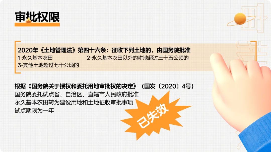 (二)根据《国务院关于授权和委托用地审批权的决定》(国发〔2020〕4号),国务院委托试点省、自治区、直辖市人民政府批准永久基本农田转为建设用地和土地征收审批事项,试点期限为一年。(已失效)