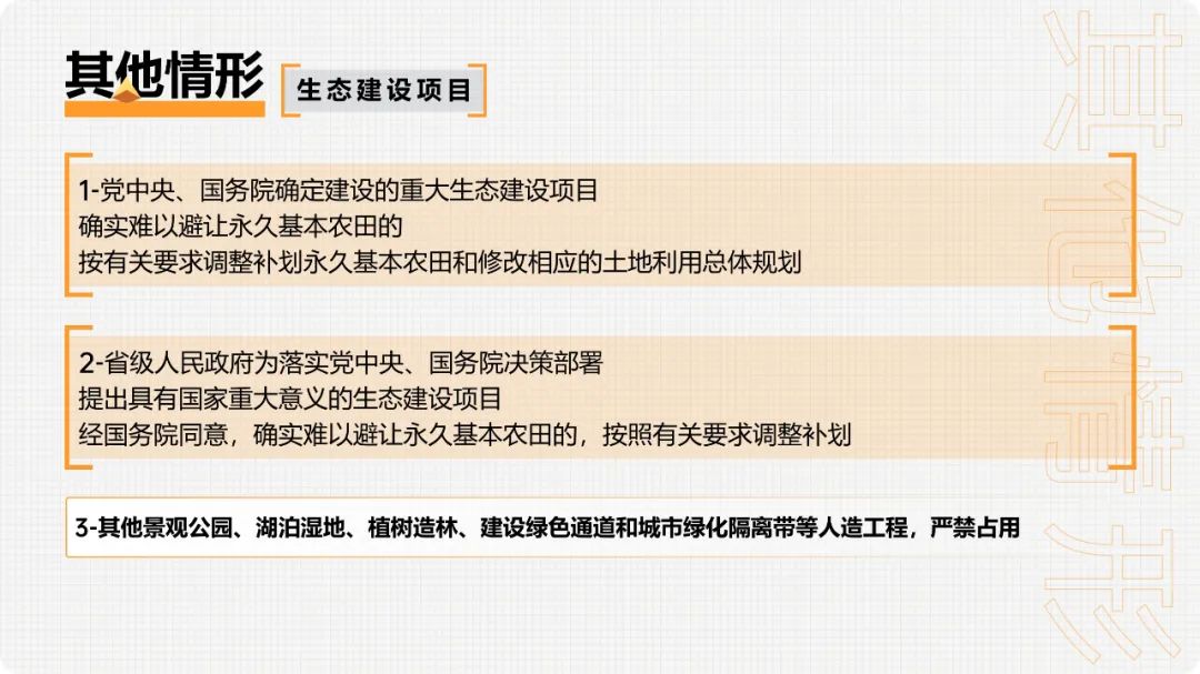 1.党中央、国务院确定建设的重大生态建设项目,确实难以避让永久基本农田的,按有关要求调整补划永久基本农田和修改相应的土地利用总体规划。