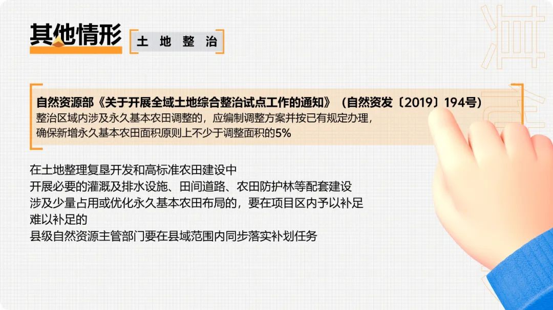 根据自然资源部《关于开展全域土地综合整治试点工作的通知》(自然资发〔2019〕194号)规定:整治区域内涉及永久基本农田调整的,应编制调整方案并按已有规定办理,确保新增永久基本农田面积原则上不少于调整面积的5%。整治区域完成整治任务并通过验收后,更新完善永久基本农田数据库。