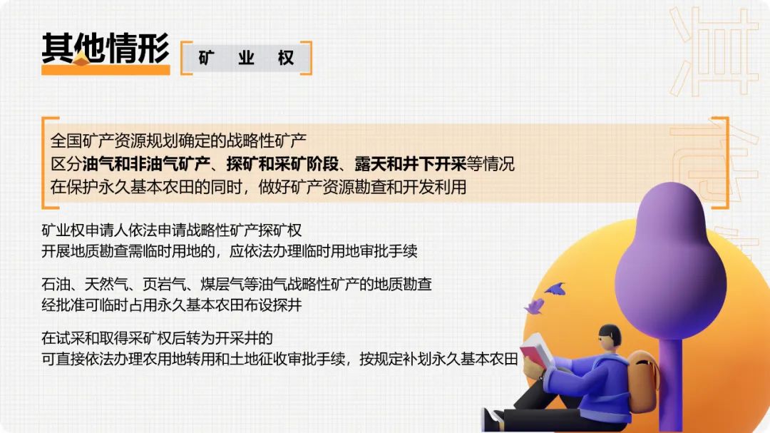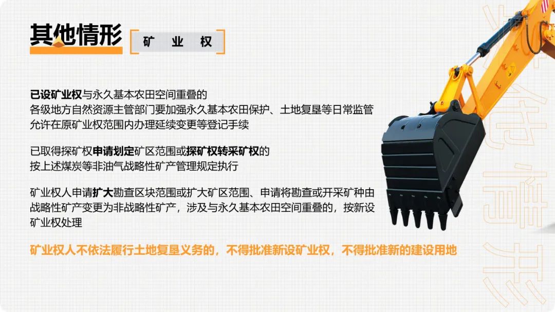 3.已设矿业权与永久基本农田空间重叠的,各级地方自然资源主管部门要加强永久基本农田保护、土地复垦等日常监管,允许在原矿业权范围内办理延续变更等登记手续。已取得探矿权申请划定矿区范围或探矿权转采矿权的按上述煤炭等非油气战略性矿产管理规定执行。矿业权人申请扩大勘查区块范围或扩大矿区范围、申请将勘查或开采矿种由战略性矿产变更为非战略性矿产,涉及与永久基本农田空间重叠的,按新设矿业权处理。矿业权人不依法履行土地复垦义务的,不得批准新设矿业权,不得批准新的建设用地。