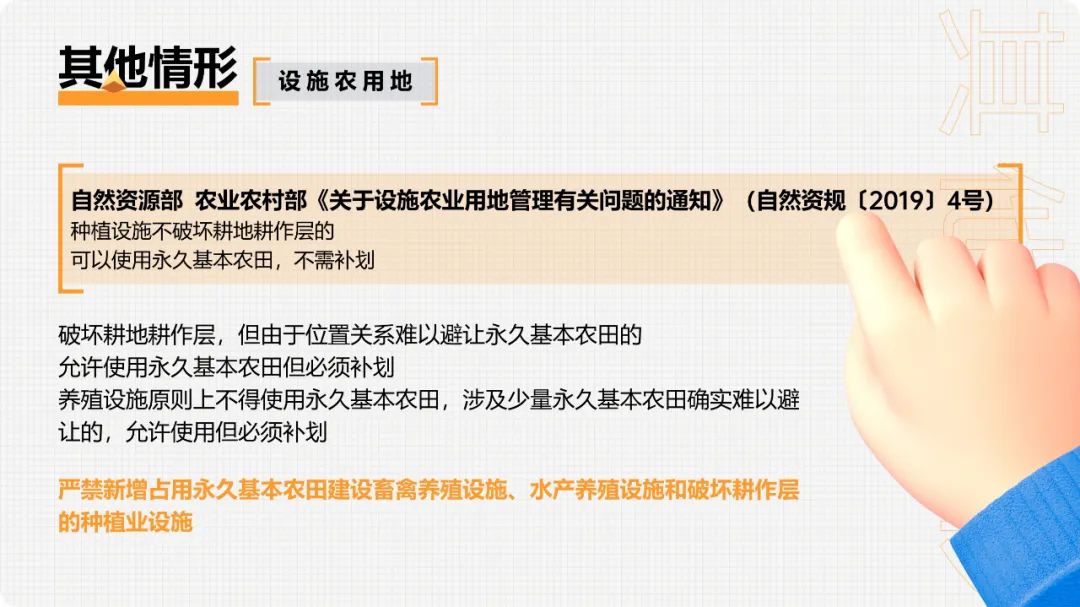 自然资源部 农业农村部《关于设施农业用地管理有关问题的通知》(自然资规〔2019〕4号)规定,种植设施不破坏耕地耕作层的,可以使用永久基本农田,不需补划;破坏耕地耕作层,但由于位置关系难以避让永久基本农田的,允许使用永久基本农田但必须补划。养殖设施原则上不得使用永久基本农田,涉及少量永久基本农田确实难以避让的,允许使用但必须补划。